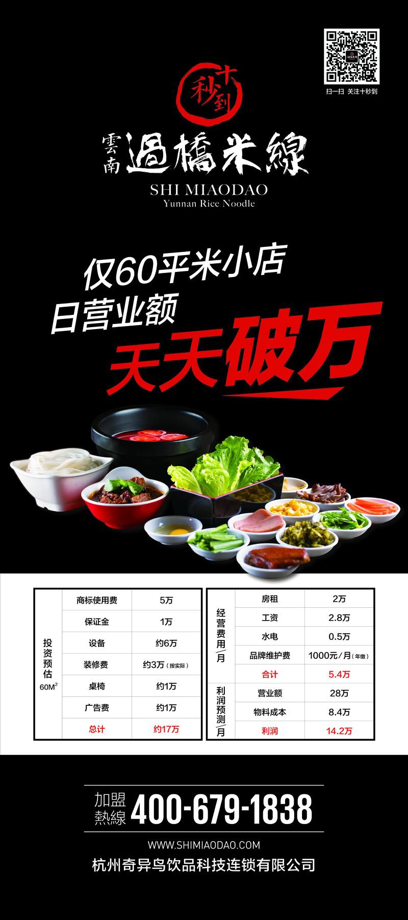 十秒到云南過橋米線是杭州奇異鳥餐飲科技連鎖有限公司重金打造的餐飲連鎖品牌。奇異鳥公司創立于1999年,是國內唯一一家以原物料源頭生產提供、品牌咨詢管理、直營門店體系建設、原物料終端消費為一體的綜合型企業。旗下擁有5家全資分公司、2家控股公司、8個連鎖品牌、5000多家門店。十秒到云南過橋米線 家店在杭州開業,便受到廣大消費者的廣泛好評。自今年4月份開放代理以來,更是在短短三個月里簽約20多個區域代理,90多家門店遍布全國各省市。創造了60平米小店日進萬元的神話!